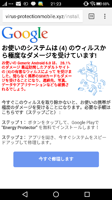 突然スマホに怪しい警告文 お使いのシステムは 4 のウィルスから極度なダメージを受けています よしねこ自由帳